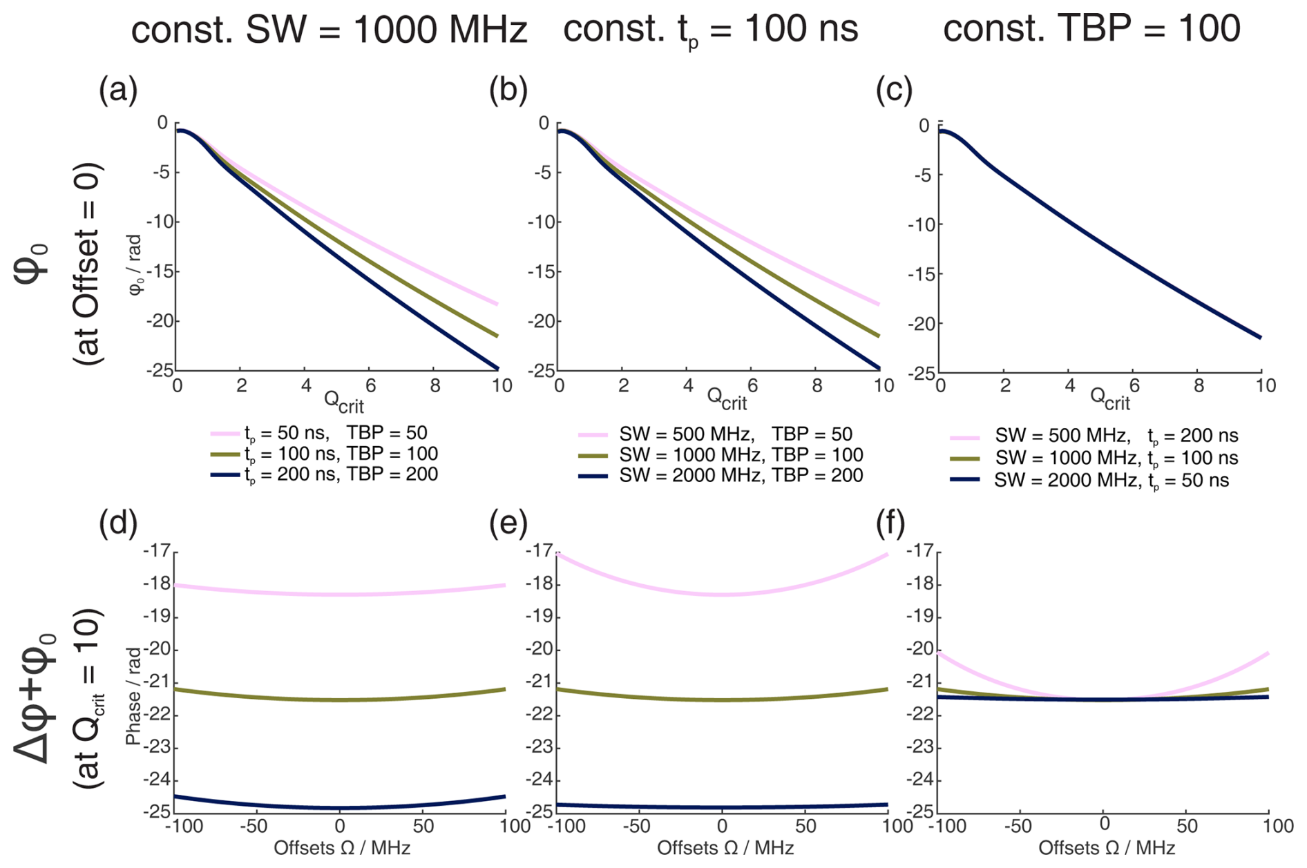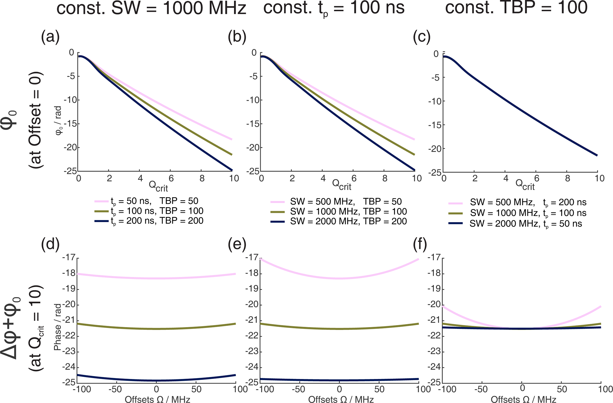 Figure 1Numerical Bloch simulations of two pulse chirp Hahn echoes with a pulse length ratio of 2 : 1. The top row (a–c) shows the phase ϕ0 at offset Ω=0 MHz as a function of Qcrit of the second pulse, and the bottom row (d–f) shows the combination of ϕ0 and Δϕ at Qcrit=10 as a function of Ω. For each column (a and d, b and e, c and f), either the sweep width SW, the pulse length of the last pulse tp, or the time bandwidth product (TBP) is held constant, while the other two parameters are varied. The nonlinear behavior at low values of Qcrit stems from incomplete coherence inversion and will not be considered further here.