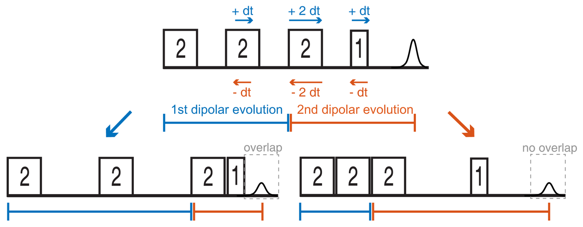Therefore, we considered only the regular refocused echo pathway, which required that the refocusing of dipolar frequencies by the solid echo be without frequency dispersion. This was done computationally by considering two coherence pathways (one for the refocused echo and one for the solid echo) and by solving Eq. (8), which led us to a sequence with a pulse length ratio of 2 : 3 : 1 : 4 and the sweep directions of up–down–up–down (there are also numerous other similar solutions). The 2 : 1 relationship between the first and the third pulse ensures refocusing of the dipolar coupling without offset frequency dispersion. The relative pulse lengths are much more favorable than with the 4 : 3 : 2 : 1 sequence since, in the new sequence, the relative pulse lengths of the pulses are short compared to the pulse lengths of the π pulses. This sequence will give only half the signal intensity since only magnetization which arrives with the y phase during the pulse will be refocused. Nevertheless, the sequence might be of interest for shorter distances, to which the 2 : 2 : 2 : 1 SIFTER sequence is not so well suited. We recorded a SIFTER trace with this new sequence and obtained a good SNR (see Fig. 13b). To verify that the sequence is actually suitable to record distance distributions with short distances, experiments with samples with distances shorter than 2.5 nm should be performed. Also, a proper analysis by operator formalism as performed for the 2 : 2 : 2 : 1 sequence (Doll and Jeschke, 2016) would be necessary to make sure that partial refocusing during the pulses does not make this sequence infeasible for short distances.
