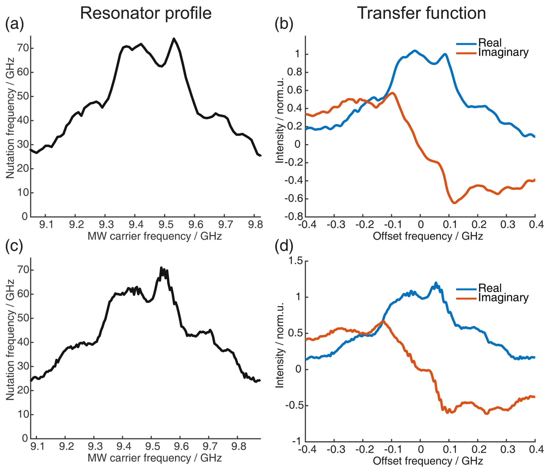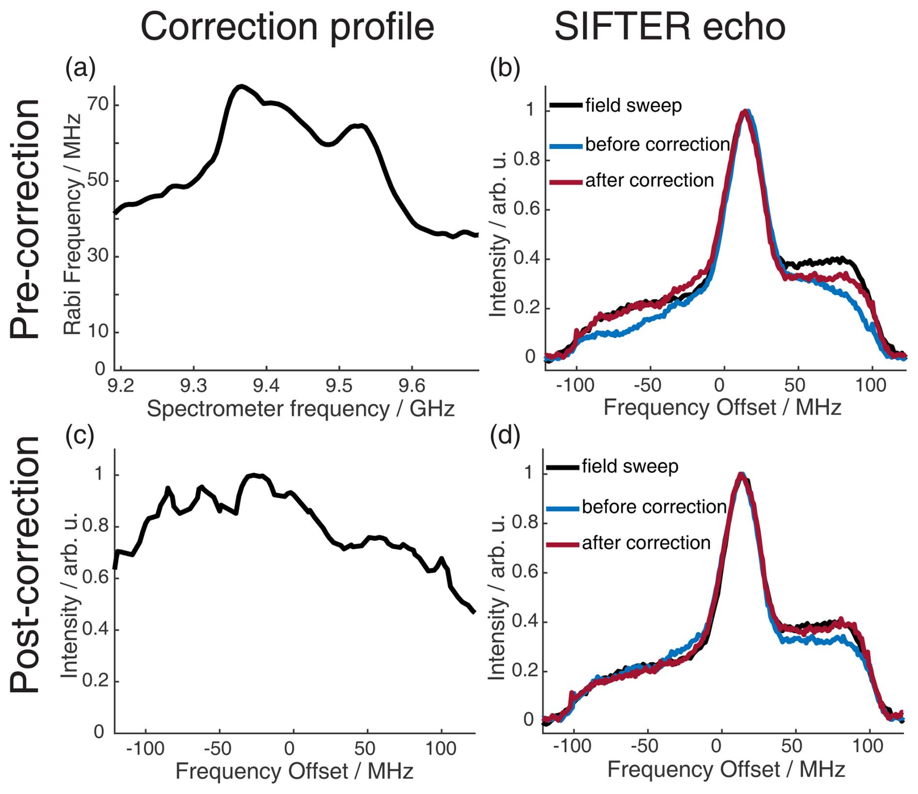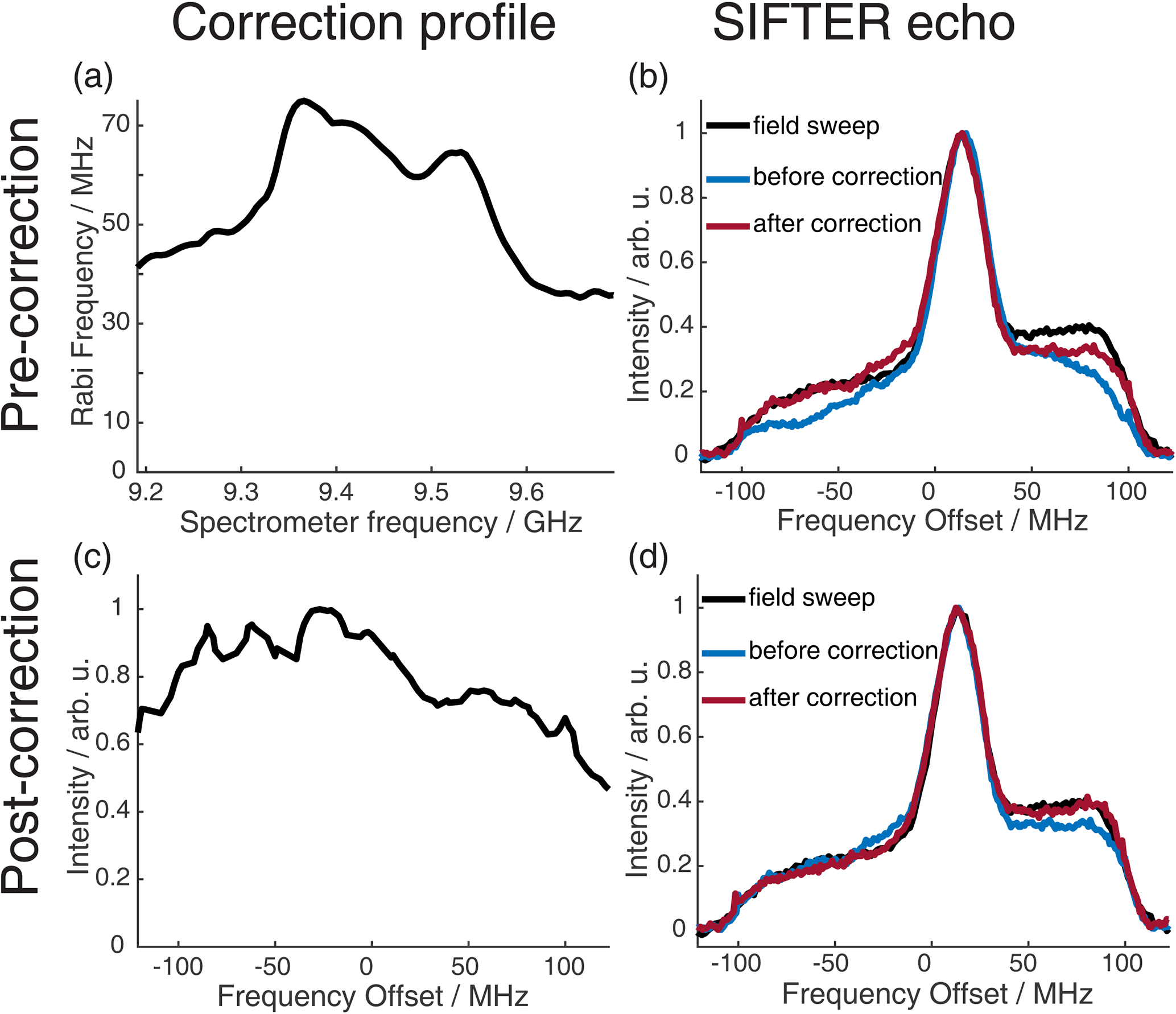 Figure 8Correction procedure to get accurate agreement between the FT of the SIFTER echo and the echo-detected field sweep. The upper part shows the pre-recording correction of the pulses, and the lower part shows the post-recording correction of the recorded SIFTER echo FT. (a) Resonator profile in the range of the pulse sweep width. (b) EDFS in black and FT of the SIFTER echo without pulse correction (blue) and with pulse correction in red. (c) SIFTER echo excitation profile (see main text and Sect. A5 in the Appendix for details). (d) EDFS in black, FT of SIFTER echo with corrected pulses in blue, and FT of SIFTER echo divided by excitation profile in panel (c) in red.
