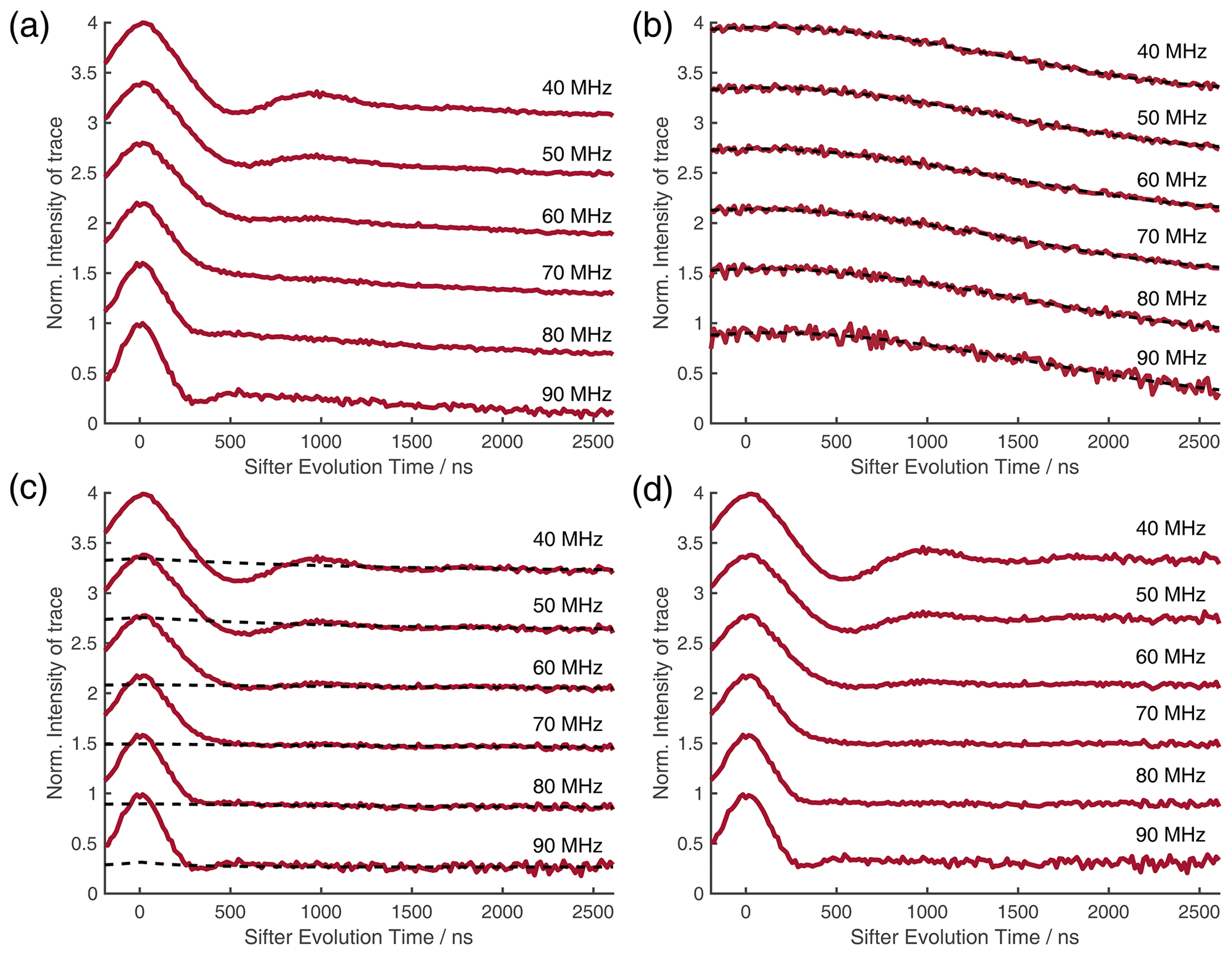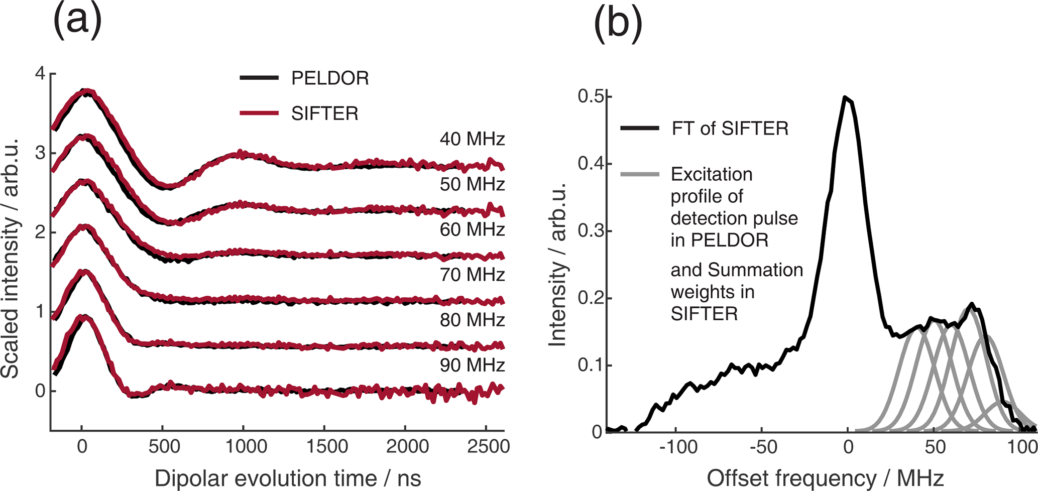 Figure 9Comparison of 2D-SIFTER and orientation selective PELDOR time traces of a doubly Çm-labeled RNA duplex recorded at X-band frequencies. (a) Orientation selective PELDOR traces with detection pulses applied at offsets 40–90 MHz from the position of the pump pulse (black) and slices of the 2D-SIFTER experiment weighted by the Gaussian-shaped pulse excitation profiles of the detection pulses used in the PELDOR experiment (red). The SIFTER traces were first divided by the corresponding SIDRE traces and afterwards by an exponential; for the PELDOR traces a typical background correction was applied. Afterwards, all traces were scaled to the same modulation depth. (b) FT of the SIFTER echo at in black and excitation profiles of the detection pulses used in the PELDOR experiments shown in light gray for the different offset positions. The excitation profiles correspond to the summation weighting for generation of the SIFTER slices shown in panel (a).