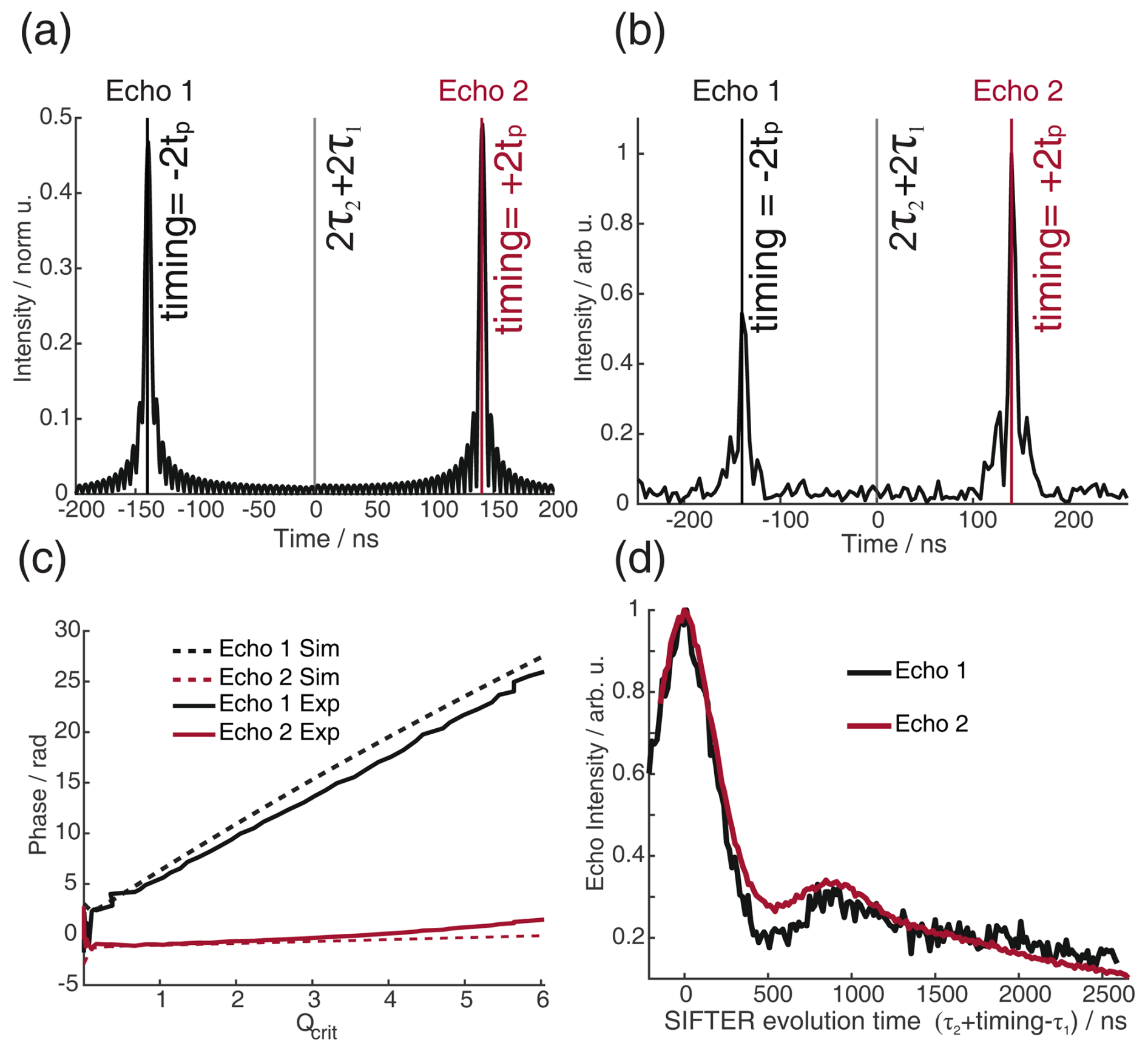 Figure 6(a) Absolute echo intensity of four-pulse SIFTER echo at τ1=τ2 as a function of AWG amplitude. (b) Intensity of four-pulse SIFTER echo as a function of Qcrit in black (values calculated from panel (a)) and Bloch vector simulation using the same pulse sequence in red.