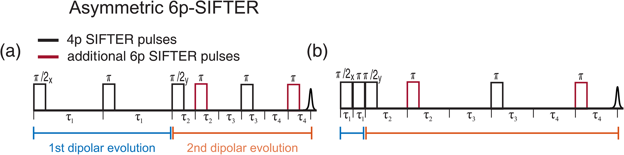 Figure 14Schematic representation of the asymmetric six-pulse SIFTER sequence. The two additional π pulses are shown in red. The first and second dipolar evolution blocks are shown in blue and orange underneath the time axis. (a) Timing of pulses at full dipolar refocusing and (b) during maximal dipolar evolution.