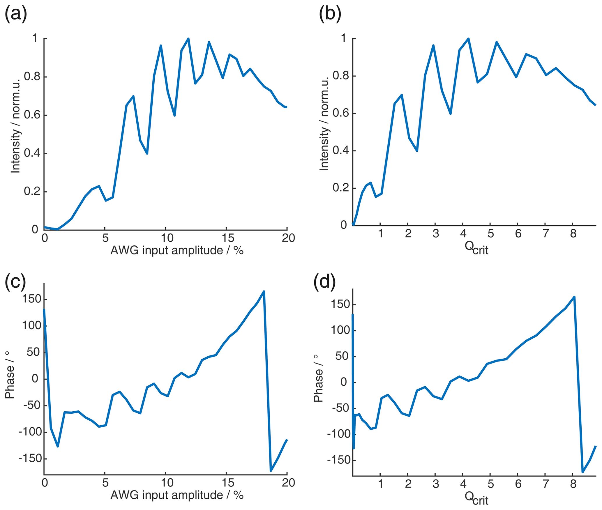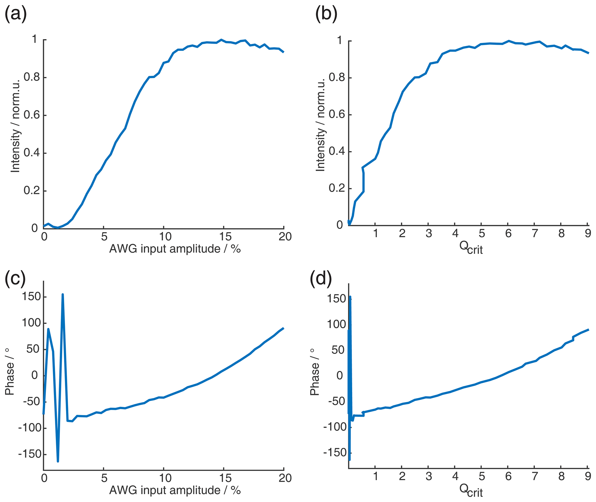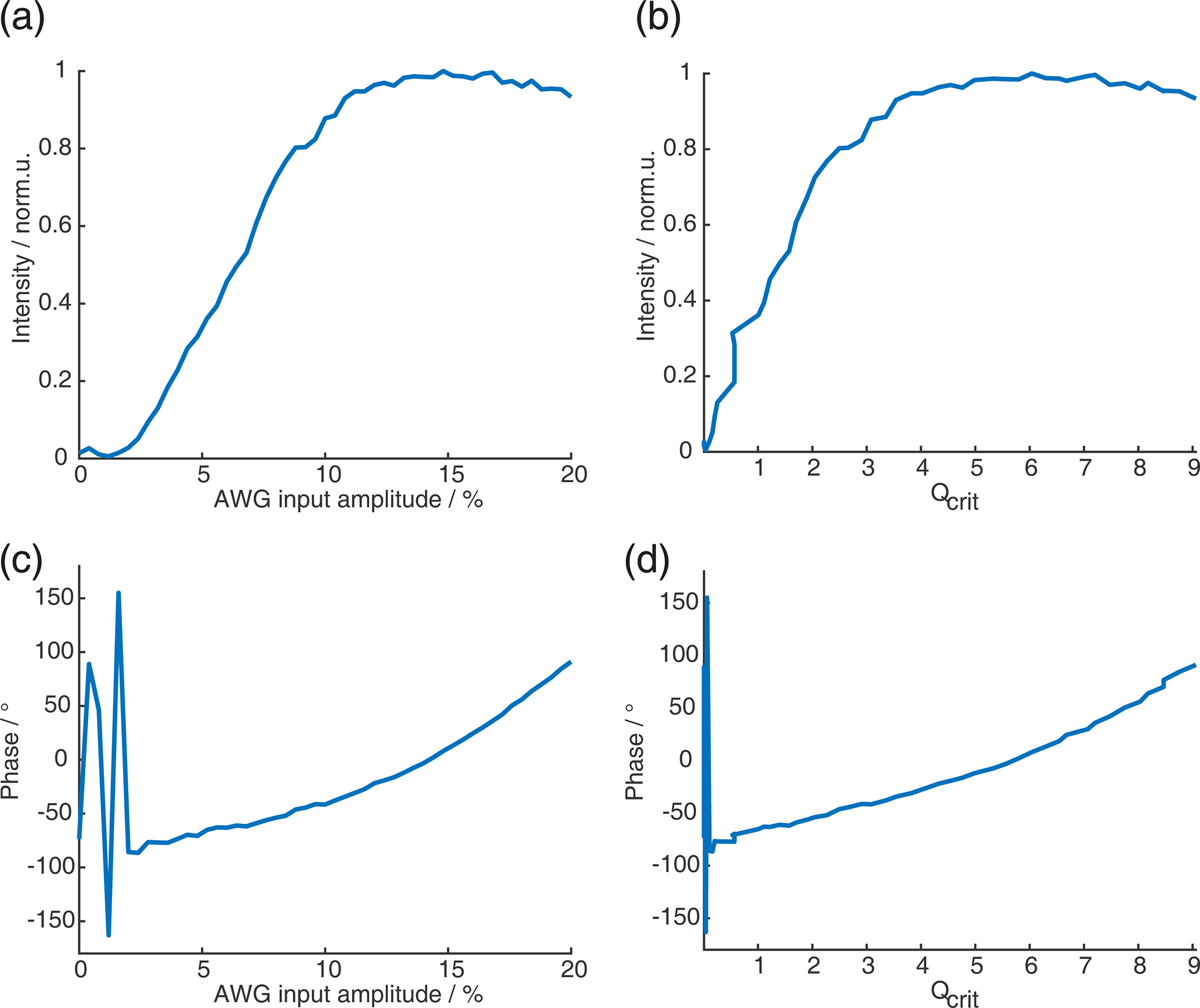 Figure C10SIFTER echo vs. amplitude of π pulses for the SIFTER sequence with a pulse length ratio of 2 : 3 : 1 : 4. (a) Absolute intensity of the SIFTER echo as a function of the AWG input amplitude of the shortest π pulse (all other π pulses are increased so that Qcrit between them stays constant). (b) Same as panel (a) but as a function of Qcrit. (c) Phase of SIFTER echo as a function of the AWG input amplitude. (d) Same as panel (c) but as a function of Qcrit.