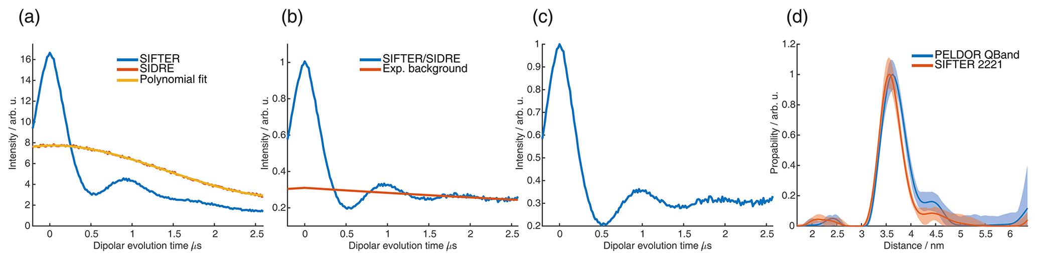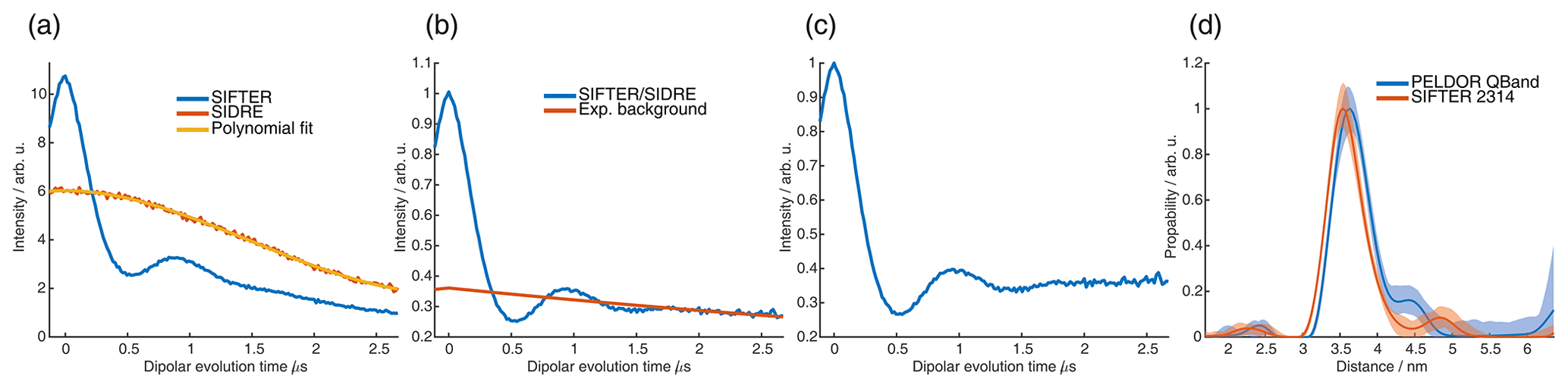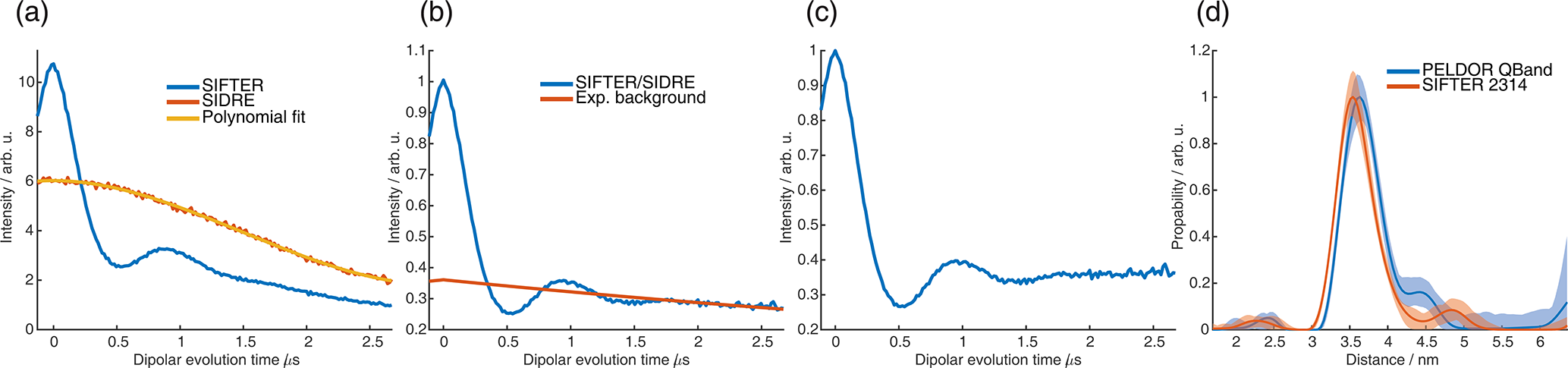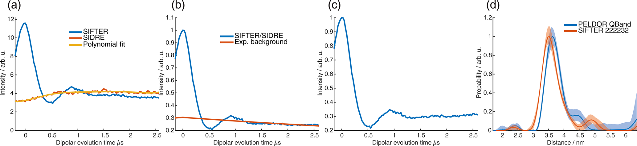 Figure C11(a) Four-pulse SIFTER (blue) and three-pulse SIDRE (orange) trace averaged over the whole nitroxide spectrum and a polynomial fit of the three-pulse SIDRE trace. (b) Four-pulse SIFTER data divided by the polynomial fit of three-pulse SIDRE data (blue) and the exponential background fitted by DeerAnalysis (orange). (c) Form factor obtained by the division of the blue trace of panel (b) by the orange background in panel (b). (d) Distance distributions obtained by Tikhonov regularization in DeerAnalysis of the PELDOR trace recorded in the Q band (blue) and of the SIFTER form factor in panel (c) (orange).