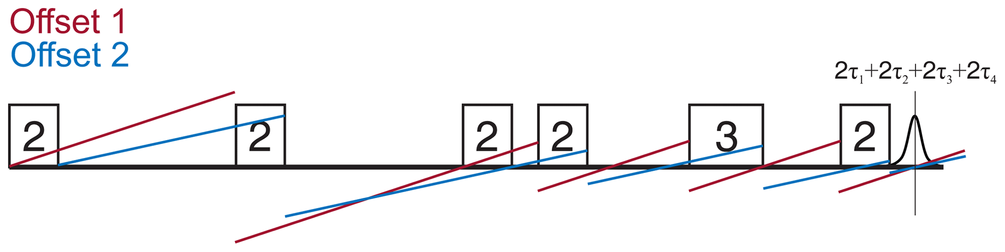 It is important to realize that, while a single chirped pulse can bring magnetization over a broad frequency range into the transverse plane, it does so by introducing a parabolic phase roll over its excitation bandwidth. This originates from the fact that spins at different offsets are brought into the transverse plane at different points in time. To distinguish this phase roll from other phase effects that we will discuss later, we gave it the symbol ϕp. The parabolic phase roll ϕp can be refocused by additional pulses of different length and/or sweep direction. Jeschke et al. (2015) showed that, for a pulse sequence of chirp pulses with the same sweep width SW, one can find a combination of pulse length ratio and sweep directions for a given coherence order pathway by satisfying the following condition: