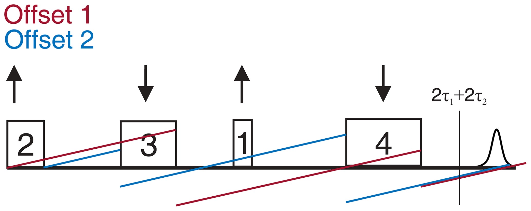 Figure C12Phase diagram of a chirped four-pulse SIFTER sequence with a pulse length ratio of 2 : 2 : 6 : 3 and relative sweep directions of up–down–down–down (also indicated by arrows). The red and blue lines represent the phase gain of two spins with different Larmor frequencies that are excited at low and high frequencies, respectively. The sequence refocuses two coherence pathways. The typical refocused echo coherence pathway where the third pulse does not influence the evolution of the frequency offset and a second pathway where the third pulse leads to coherence inversion.