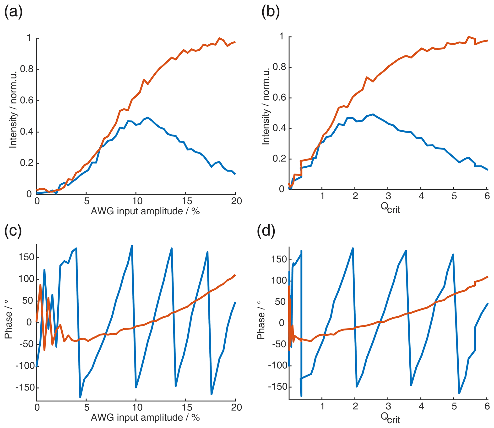 Figure C13SIFTER echo vs. amplitude of π pulses for the SIFTER sequence with a pulse length ratio of 2 : 2 : 6 : 3. (a) Absolute intensity of the SIFTER first (blue) and second (orange) echo as a function of THE AWG input amplitude of the shortest π pulse (all other π pulses are increased so that Qcrit between them stays constant). (b) Same as panel (a) but as a function of Qcrit. (c) Phase of first (blue) and second SIFTER echoes as a function of the AWG input amplitude. (d) Same as panel (c) but as a function of Qcrit.