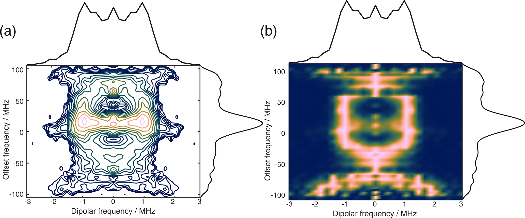 Figure D3The 2D EPR-correlated SIFTER data of the six-pulse SIFTER experiment with a pulse length ratio of 2 : 2 : 2 : 2 : 3 : 2 and sweep directions of only upsweeps. The background correction procedure is described in Sect. D. The dipolar spectrum shown above the correlation plots is the sum of all dipolar spectra, and the EPR spectrum shown on the side is the real part of the direct FT at the maximum of the time trace. (a) Contour plot of the 2D FT of SIFTER echoes with logarithmically spaced contour lines. (b) Heatmap of the 2D FT of SIFTER echoes where each dipolar spectrum was normalized and squared to facilitate visually following the main peaks in the dipolar spectrum.