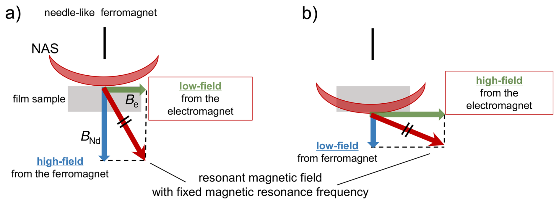 Figure 1In our one-dimensional MRI approach, the resonance frequency was fixed, and a spatially selective RF pulse with an RF field strength of nominal 50 kHz was applied. This pulse excites nuclear spins only within a narrow slice (the NMR-active slice; NAS), whose spatial position is defined by the static field gradient at the chosen resonance frequency. By incrementally varying the static magnetic field, the effective field gradient experienced by the sample changes, and consequently, the position of the NAS is shifted along the thickness direction of the film. The combined effect of the magnetic field generated by the needlelike ferromagnet, BNd, and the static magnetic field from the electromagnet, Be, gives rise to the mechanism of movement of the NMR-active slice.
