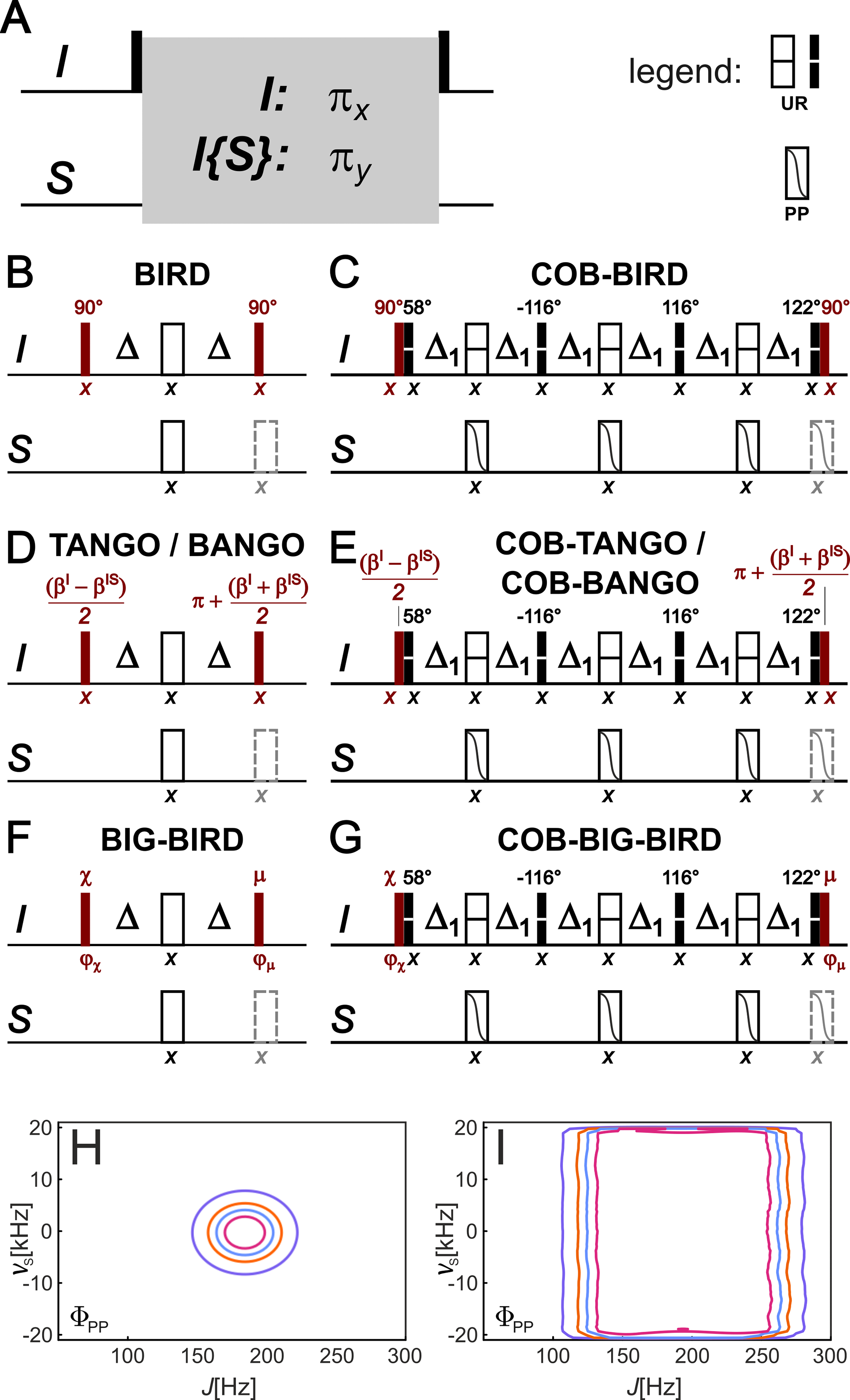 Figure 1Construction of any type of bilinear rotation from a single spin system selective π rotation element. The underlying insight into the construction scheme is the fact that any of the basic bilinear rotations in literature is based on two flanking pulses (shown in dark red) around the very same rotation scheme that provides a πx rotation for an uncoupled spin I and a πy rotation for an IS spin system, with a coupling constant that is matched to sequence (A, rotation element represented by the gray box). Corresponding BIRD, TANGO, BANGO, and BIG-BIRD bilinear rotations are obtained by specifically chosen flanking pulses (B, D, and F). If the simple refocused delay with is replaced by a more robust spin system selective π rotation element, like the one here derived from the recently published COB-BIRD bilinear rotation (Woordes et al., 2025), any type of bilinear rotation can be obtained by simply using corresponding flanking pulses with the element (C, E, and G). Be aware that consecutive pulses before and after the rotation element – consisting of the red flanking pulses and the first/last pulse of the central element – are represented for clarity as separate pulses but may be combined to a single pulse (or universal rotation pulse shape) in a particular application. Also note the convention for point-to-point (PP)- and universal rotation (UR)-shaped pulses in the upper-right corner, marked with legend following reference (Ehni and Luy, 2014). Corresponding robustness with respect to the coupling J and the offset of the heteronucleus νS for the two rotation elements is simulated using the quality factor ΦPP, as defined in Woordes et al. (2025). Δ1 is set to 2.583 ms (Woordes et al., 2025).