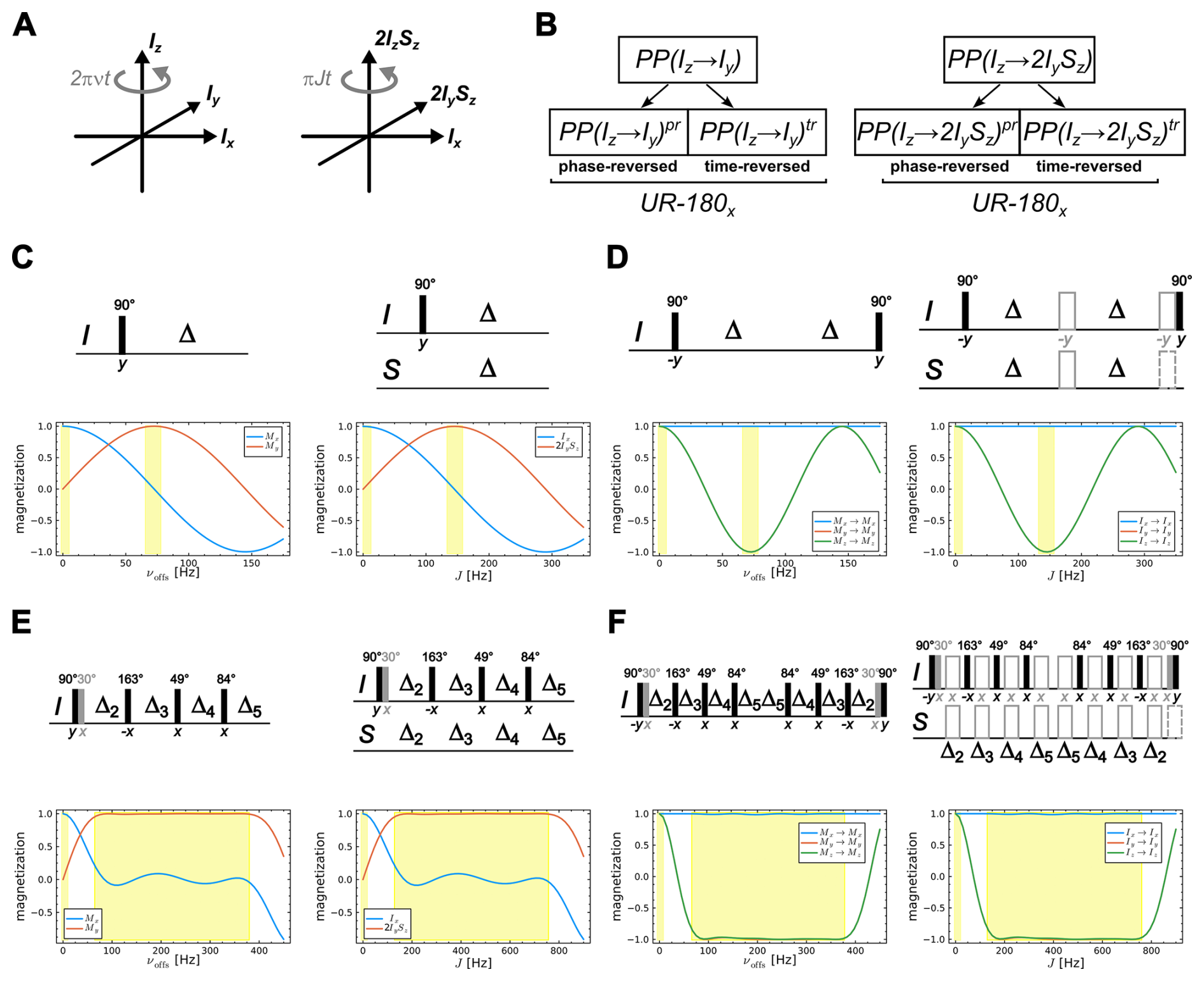 Figure 2Construction principle for obtaining a bilinear rotation element from an INEPT-type transfer element. The principle uses the equivalent of a heteronuclear coupled two-spin system (A) to an offset selective shaped pulse (A') as both interactions describe a rotation in a 3D Hilbert (sub)space. The previously reported construction principle from an effective point-to-point pulse to a universal π rotation (Luy et al., 2005) (B) can then be extended to construct a BIRD bilinear rotation from a reduced INEPT sequence following essentially the same construction procedure (B'). A simple selective excitation scheme (C, top), equivalent to an on-resonant, reduced INEPT element (C', top), will then be constructed to give a selective π rotation (D, top) and the corresponding bilinear rotation (D', top), respectively. Introducing a pair of 180° pulses (D', drawn in gray) results in the offset-compensated classical scheme. Corresponding offset and J dependencies of excited coherences and magnetization transfers are given below the sequences. Note that the factor 2 in the offset vs. J dependence results from the rotation frequency of the two interactions. Using a more elaborate INEPT-type transfer element like the reduced COB3-INEPT (Ehni and Luy, 2014) (E, E') highly J-compensated bilinear rotations can be constructed (F, F'). Note that 30° pulses (drawn in gray) are added to the original COB3-INEPT sequence to ensure the transfer Iz→Ix for vanishing offsets or J couplings, respectively (E, E', F, F'). Delays are taken from Ehni and Luy (2014) to be Δ2=4.221, Δ3=2.0634, Δ4=2.14, and Δ5=1.075 ms.