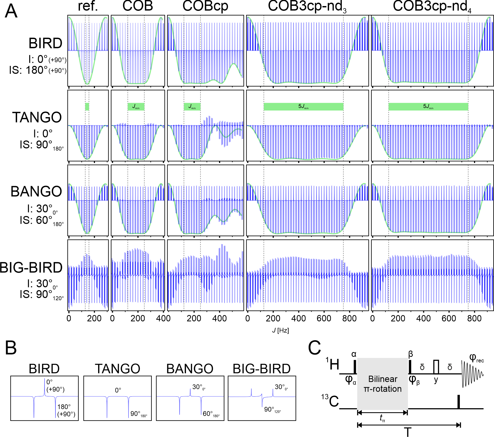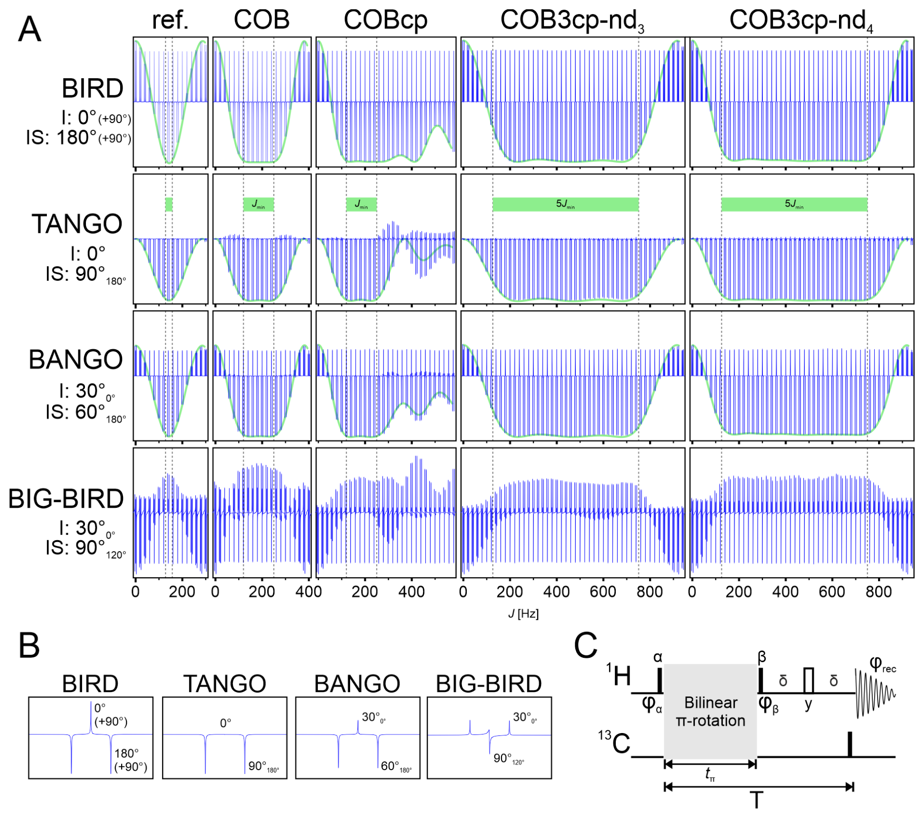 The central π-rotation elements used for the different J profiles are summarized in Fig. 4D–H. The original spin system selective π rotation is based on a refocused delay of duration . The π rotation of the recently reported COB-BIRD (Woordes et al., 2025), as derived in Fig. 1, constitutes the second element. Further π rotations use the construction principle with previously derived COB-INEPT (Ehni and Luy, 2012) and COB3-INEPT (Ehni and Luy, 2014) building blocks, as described in the previous section and in Fig. 2. The resulting elements are called COBcp, COB3cp-nd3, and COB3cp-nd4, where cp indicates the use of the construction principle and ndi is the number of delays of the original INEPT-type building block.