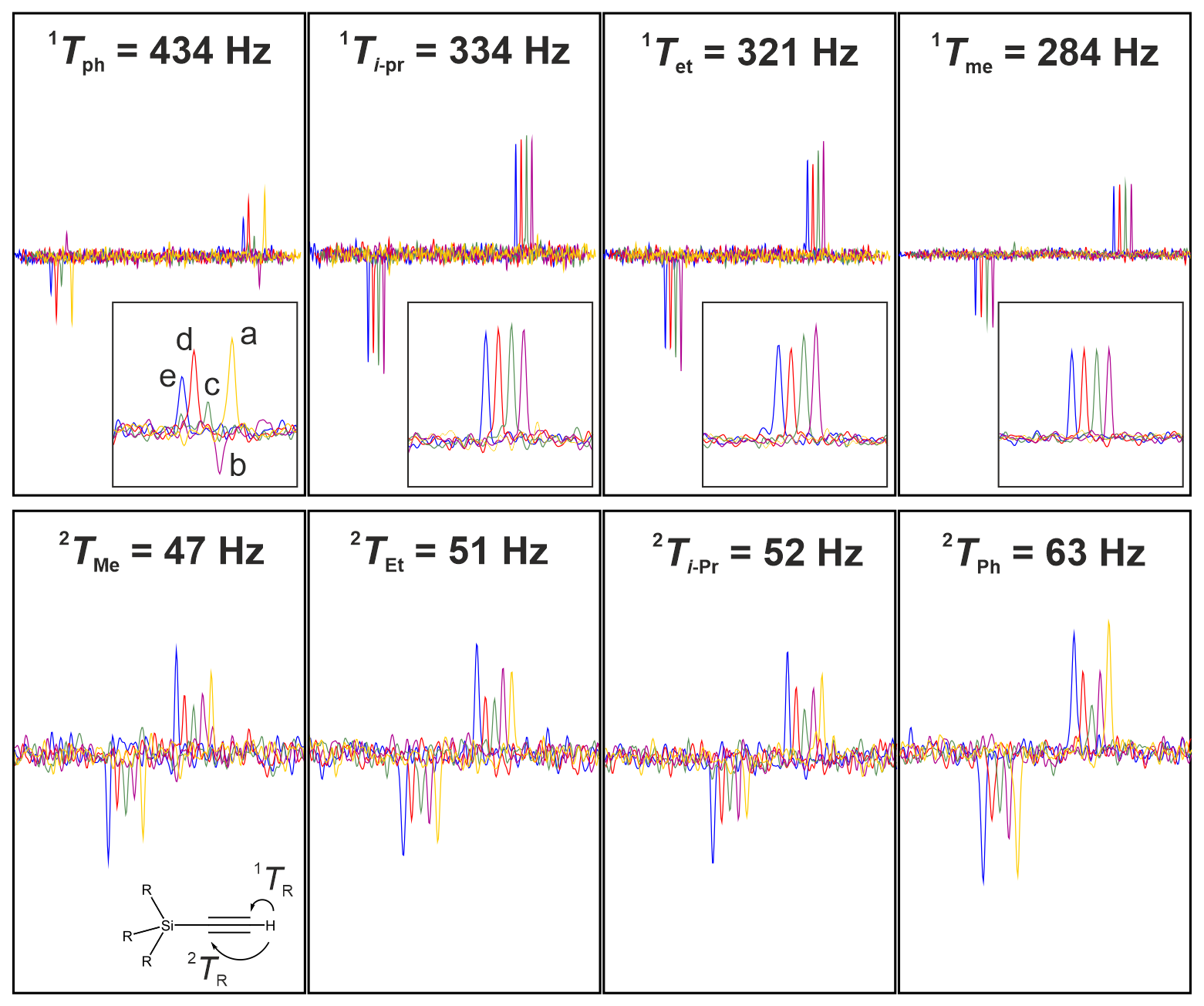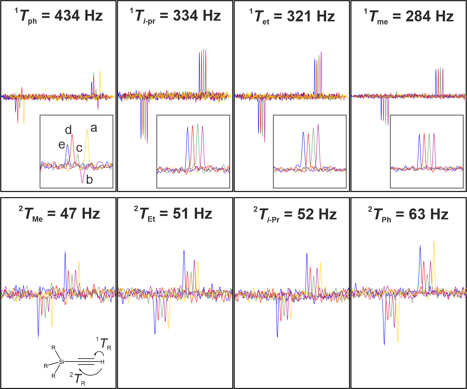Figure 7Comparison of acetylene signals for the various bilinear π-rotation elements using a J-resolved homonuclear-decoupled 13C-detected INEPT sequence. Shown are traces along the indirect J dimension with heteronuclear coupling evolution and 1H,1H homonuclear decoupling. Details of the pulse sequence are summarized in Fig. 4B. For the measurement, the same silicic acetylene compounds as shown in Fig. 5 are dissolved in an 11 % lyotropic mesophase consisting of PBLG/CDCl3. Under partial alignment, total 1TCH and 2TCH couplings from scalar and residual dipolar contributions range from 47 to 434 Hz. The assignment and coupling size of each acetylene cross peak are indicated at the bottom left with the rest group (see gray box in Fig. 5). For the comparison, the sequence was tested using (a) BIRD, (b) COB-BIRD, (c) COB-BIRDcp, (d) COB3-BIRDcp-nd3, and (e) COB3-BIRDcp-nd4 bilinear rotations for homodecoupling. The BIRD filter was matched to 145 Hz transfer delays – which happens to result in a perfect transfer for 145 Hz and 3⋅145 Hz = 435 Hz. For covering all couplings with the best possible intensities, the delays for the COB-BIRD, COB-BIRDcp, COB3-BIRDcp-nd3, and COB3-BIRDcp-nd4 are scaled relative to the values given in the caption of Fig. 4 by 0.75, 0.75, 1.25, and 1.25, respectively.
