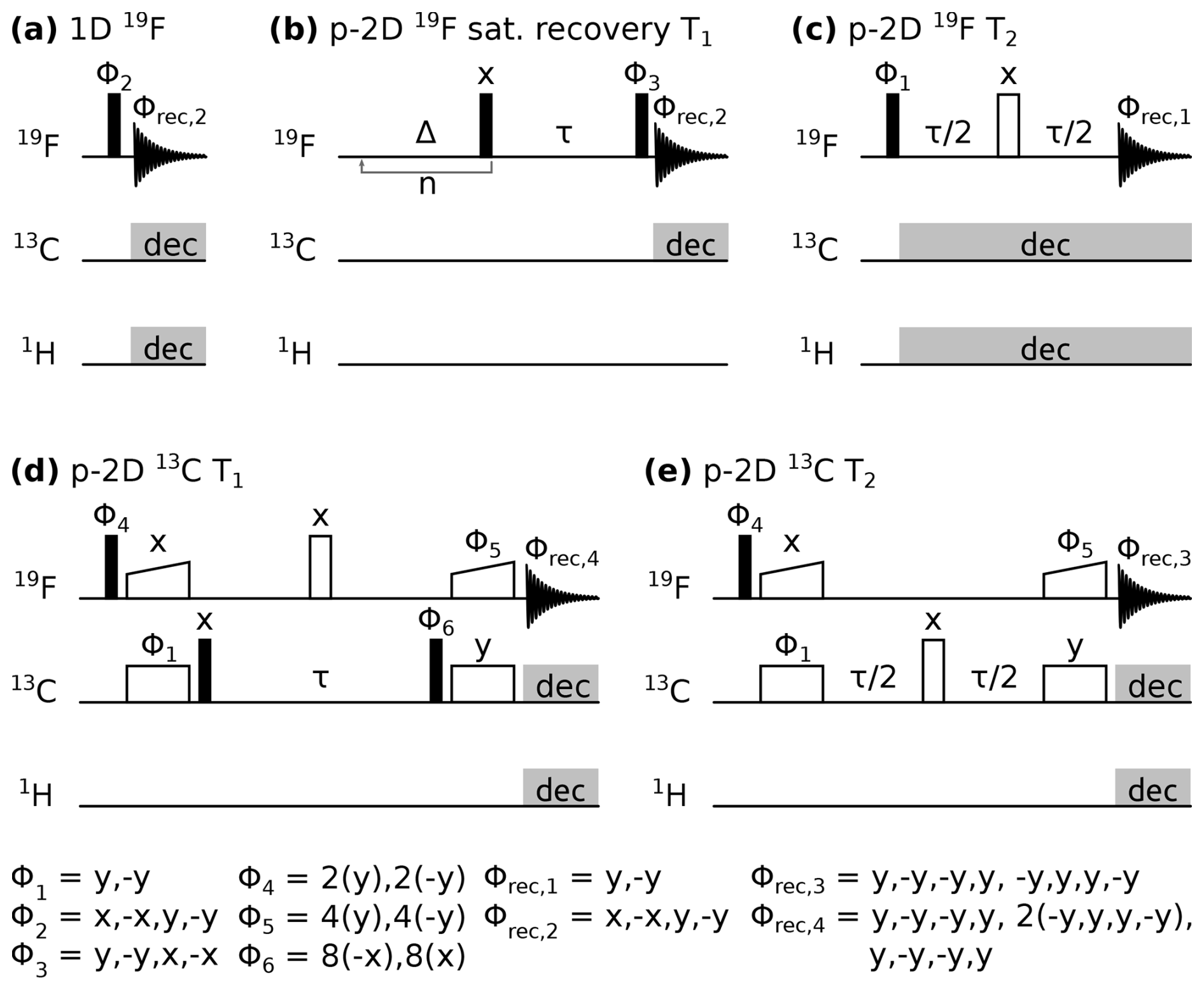 Figure 1Pulse sequences used in this study. Closed, open, and wide-open rectangles denote 90°, 180°, and CP spin-lock pulses, respectively. Grey rectangles indicate composite pulse decoupling. Δ and τ are delays, and n indicates a loop. Pulse phases are indicated above the pulse, with Φn marking a pulse undergoing phase cycling, as noted below. Acquisition is denoted with a free induction decay scheme with the receiver phase Φrec,n indicated above. p-2D stands for pseudo two-dimensional spectrum with one frequency dimension and one pseudo dimension in which a delay τ is incremented.