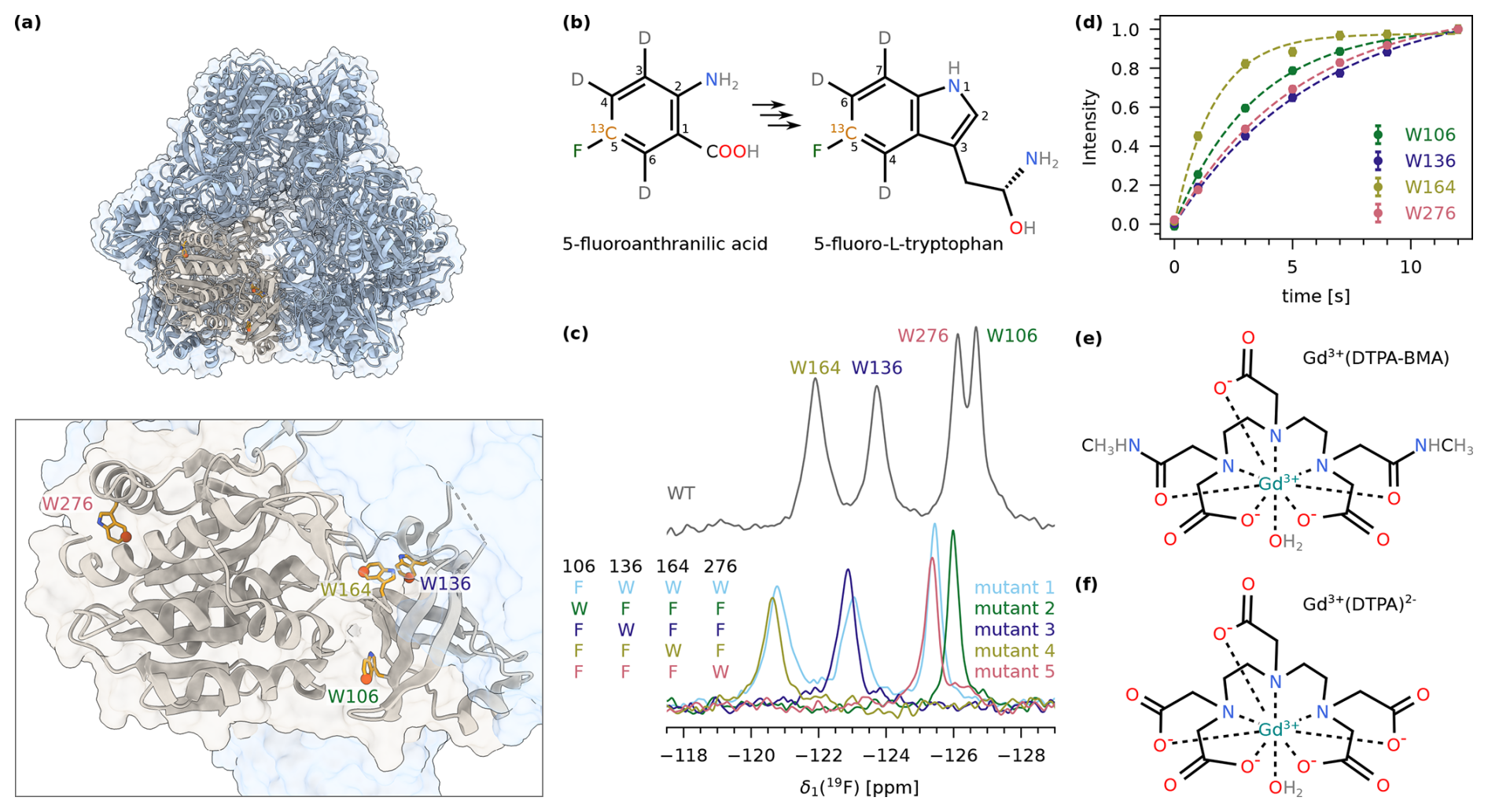 Figure 2(a) Structure of the dodecameric TET2 (PDB: 1Y0R) (Borissenko and Groll, 2005) in cartoon representation with one subunit highlighted in beige (upper panel). The lower panel shows a close-up of one subunit with the four tryptophans indicated as orange sticks. Position 5 in the tryptophan ring is highlighted with spheres. (b) Structure of 5-fluoroanthranilic acid (left), which is converted into 5-fluoro-L-tryptophan (right) by the bacteria. (c) 1D 19F MAS NMR spectrum of 5FC-W-TET. The upper panel displays the spectrum of the wild type, showing all four tryptophan peaks. The lower panel shows spectra of the five assignment mutants (mutant 1: W106F; mutant 2: W136F, W164F, W276F; mutant 3: W106F, W164F, W276F; mutant 4: W106F, W136F, W276F; mutant 5: W106F, W136F, W164F; see the Methods section for details). The resulting assignment is indicated at the top. The wild-type spectrum is shifted due to the isotope shift, as this sample is deuterated compared to the mutants. (d) Exponential fits of 19F saturation recovery experiments on 5FC-W-TET without paramagnetic dopant. (e) Structure of Gd(DTPA-BMA). (f) Structure of Gd(DTPA).