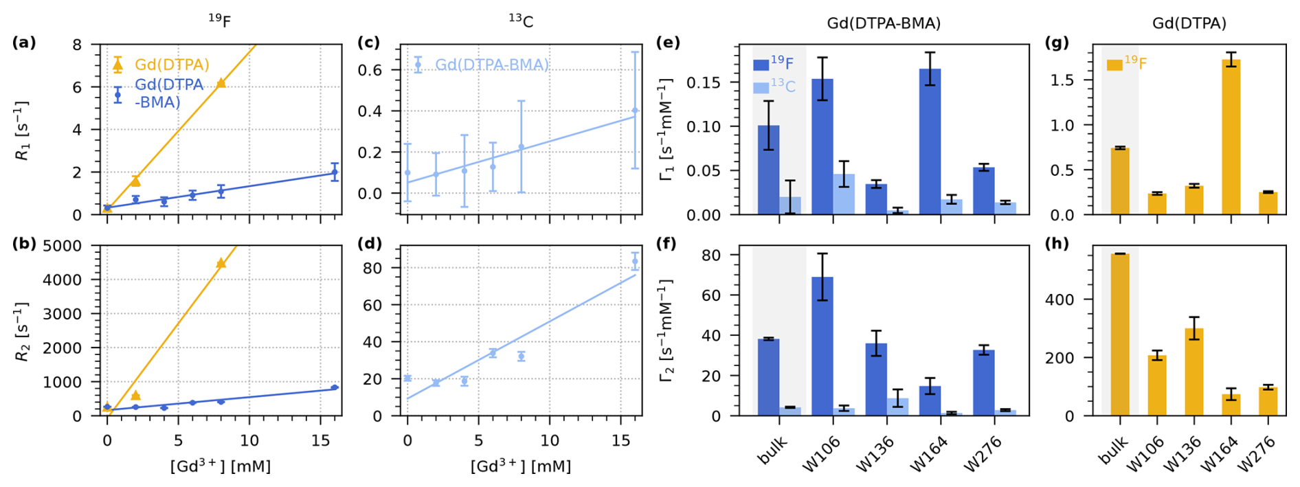 Figure 319F and 13C longitudinal and transverse PRE (Γ1 and Γ2) for Gd(DTPA-BMA) and Gd(DTPA) measured on 5FC-W-Trp. (a–b) Linear fits of bulk 19F R1 (a) and R2 (b) relaxation rate constants as a function of the concentration of Gd(DTPA-BMA) (blue) and Gd(DTPA) (yellow). (c–d) Linear fits of bulk 13C R1 (c) and R2 (d) relaxation rate constants as a function of the concentration of Gd(DTPA-BMA) (light blue). (e–f) 19F (dark blue) and 13C (light blue) Γ1 (e) and Γ2 (f) for Gd(DTPA-BMA). (g–h) 19F Γ1 (g) and Γ2 (h) for Gd(DTPA). The bulk relaxation rate constants in (a)–(d) are the average over the four residues (see Figs. S1, S2, S3, S4, S5) except for the rate at 8 mM Gd(DTPA), which was only measured as a bulk rate due to line broadening. In (e)–(h), the first bar of each plot is the bulk PRE resulting from the fits in (a)–(d) (grey background), followed by the individual values for each residue resulting from the fits in Figs. S1, S2, S3, S4, S5. Note that the per-residue fits for Gd(DTPA) (g, h) are performed with only two points (0 and 2 mM), while the bulk fit is performed with three points (0, 2, and 8 mM). This leads to a deviation between Γbulk and the average over the residue-wise values.