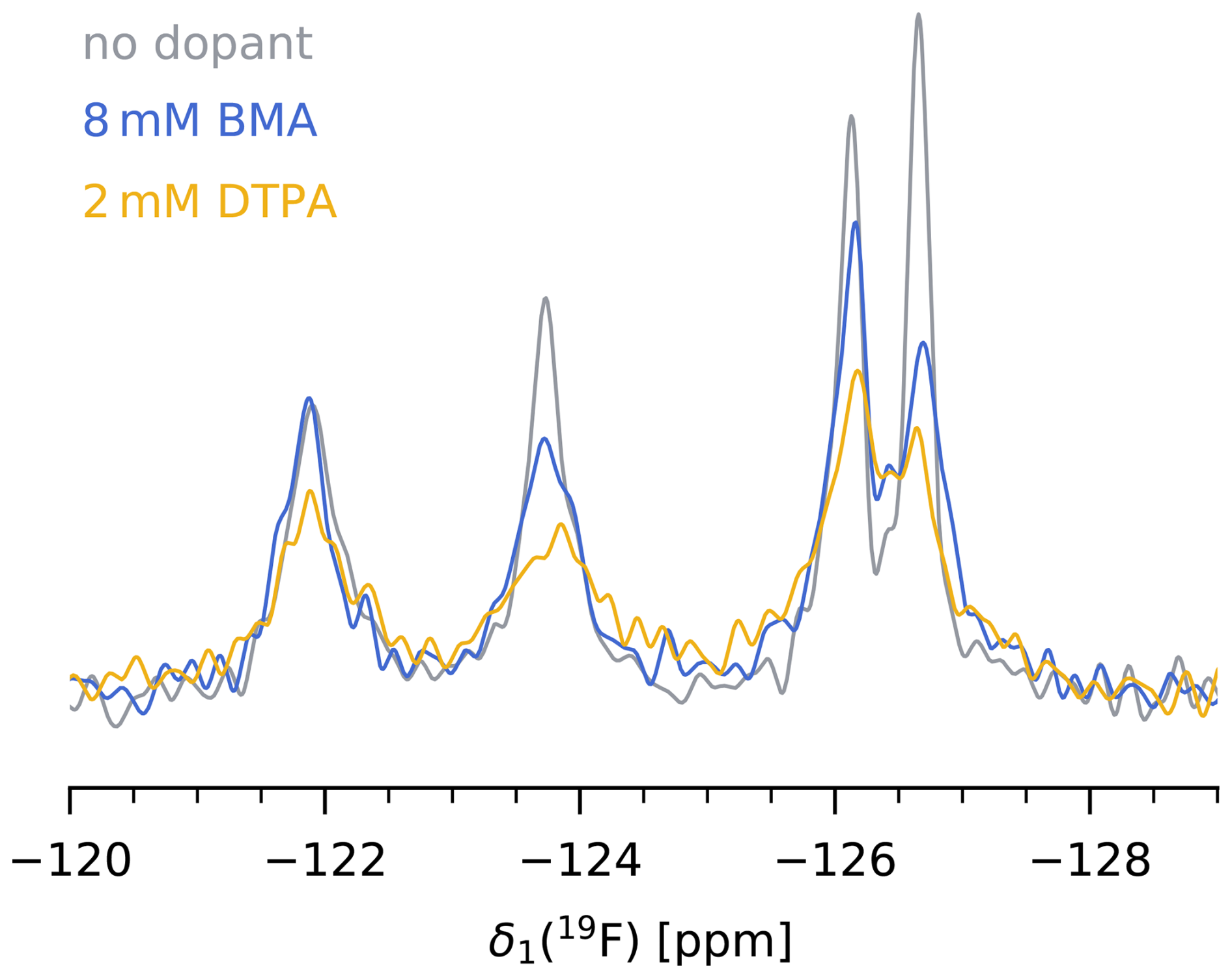Figure 419F MAS NMR spectrum of 5FC-W-TET without dopant (grey), with 8 mM Gd(DTPA-BMA) (blue), and with 2 mM Gd(DTPA) (yellow). was set to five times the 19F T1 of the slowest relaxing peak for each sample. Note that the absolute intensities between samples are not comparable, as the amount of protein inside the rotor is hard to determine.
